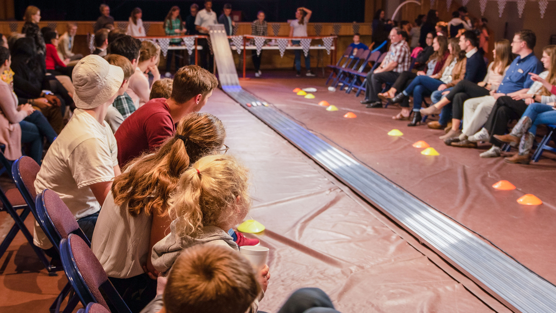 EDMOND–More than 200 Philadelphia Church of God members attended the headquarters congregation’s first pine car derby on Dec. 28, 2019 at the John Amos Field House. Herbert W. Armstrong College students, visiting singles and local families entered 105 cars, and the crowd cheered as the creatively decorated, 5-ounce pine cars sped down a 49-foot aluminum track. Race fans tracked the leader board on a projector screen, listened to announcers Dwight Falk and Grant Turgeon, ate snacks and had their photos taken in an oversized pine car made by Steve Hercus, who helped deacon Stephen Coats organize the event. His wife, Tarah Hercus, came in third with Uncle Duck; Terresa Granados’s placed second with Ride to Jerusalem; and Blue Streak, belonging to one of the Wainwright children, took first, with her father accepting the pine car trophy on her behalf since it was past her bedtime. Youths from the Edmond congregation assisted in setting up and operating the activity, and Mr. Coats said their help was “priceless.”