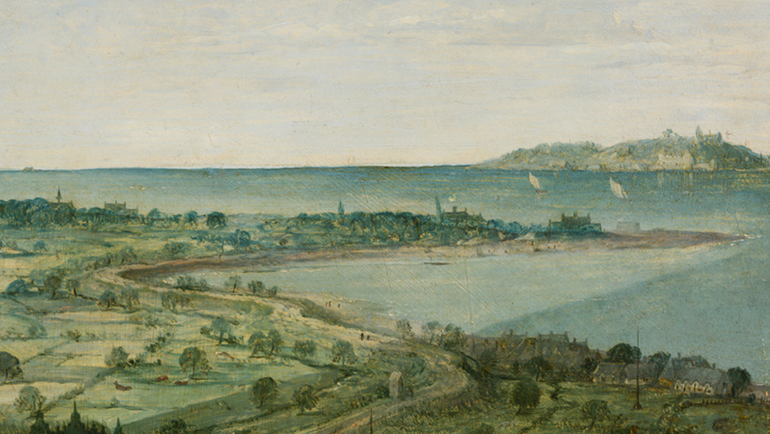 To the tower’s right, as if it were faintly emerging from the fog, sits a distant island. One can make out the sails of boats off the coast and a large town on its shores.