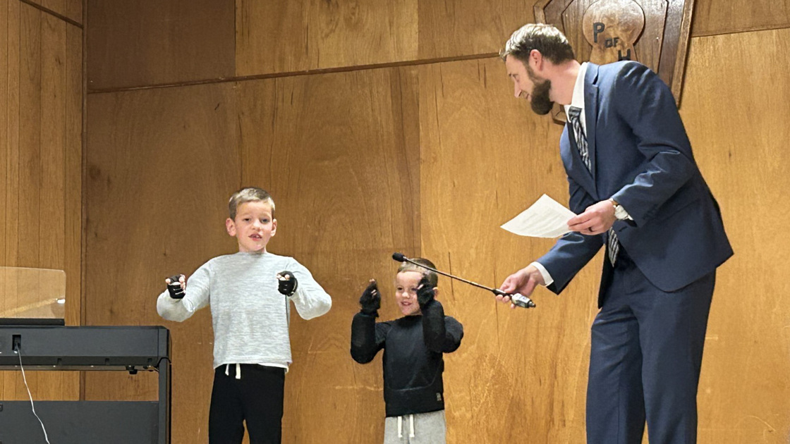 That evening, the congregation held a talent show that included a piano solo by Emma, a flute solo by Ellen Jameson, a recitation of an original poem by Mary Randall, a blues guitar solo by Brian Hallett, a vocal solo by Deborah Short, and Irish dancing solos by Liam and Owen. Ken Fehr presided over the show as emcee, assisted by his two young boys who pumped up audience “entusiasm” as very young Hans and Franz.