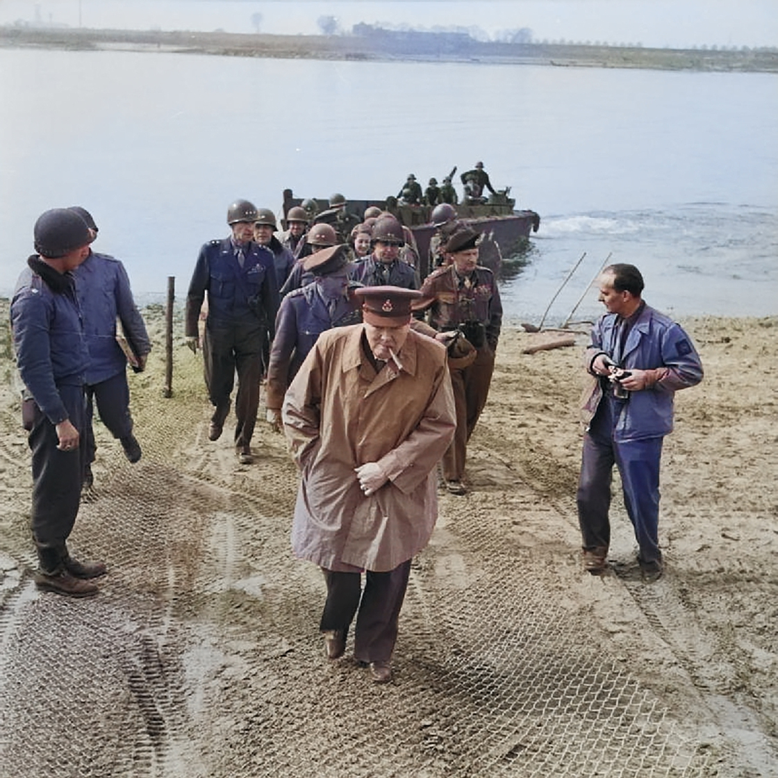 Credit: Public DomainChurchill crosses the Rhine on March 25, 1945, with U.S. and British generals.
